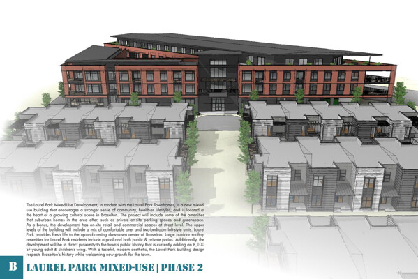 The Laurel Park Mixed-Use Development, in tandem with the Laurel Park Townhomes, is a new mixed- use building that encourages a stronger sense of community, healthier lifestyles, and is located at the heart of a growing cultural scene in Braselton. The project will include some of the amenities that suburban homes in the area offer, such as private on-site parking spaces and greenspace. As a bonus, the development has on-site retail and commercial spaces at street level. The upper levels of the building will include a mix of comfortable one- and two-bedroom loft-style units. Laurel Park provides fresh life to the up-and-coming downtown center of Braselton. Large outdoor rooftop amenities for Laurel Park residents include a pool and both public & private patios. Additionally, the development will be in direct proximity to the town's public library that is currently adding an 8,100 young adult & children's wing. With a tasteful, modern aesthetic, the Laurel Park building design respects Braselton's history while welcoming new growth for the town.
